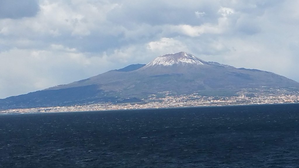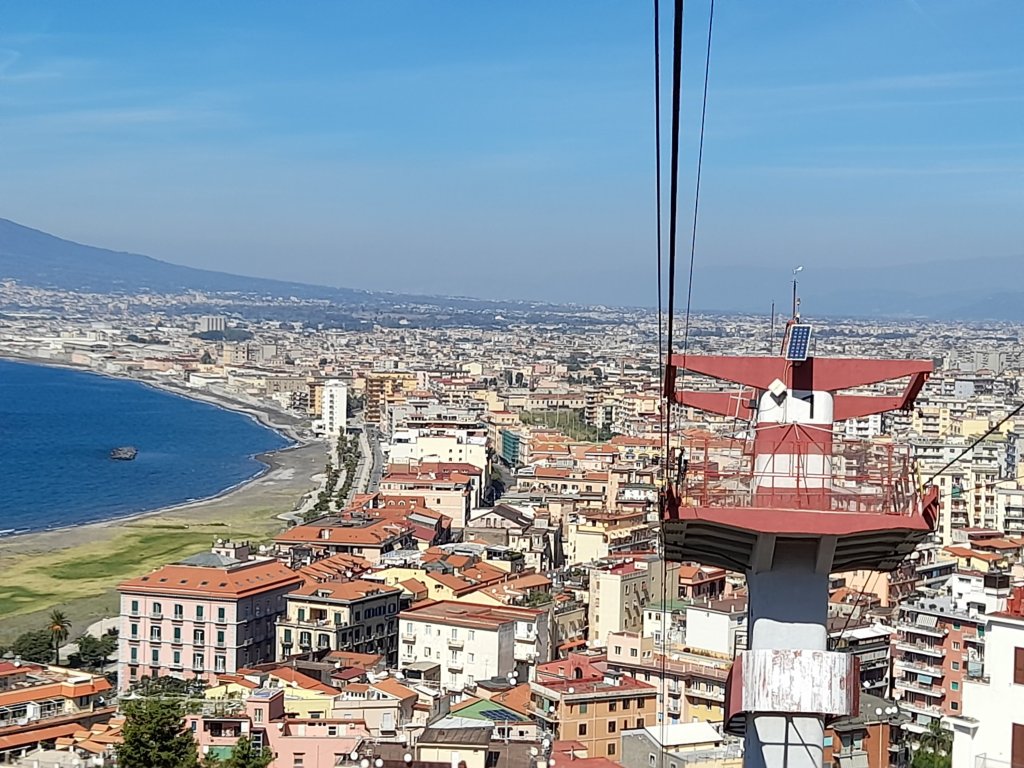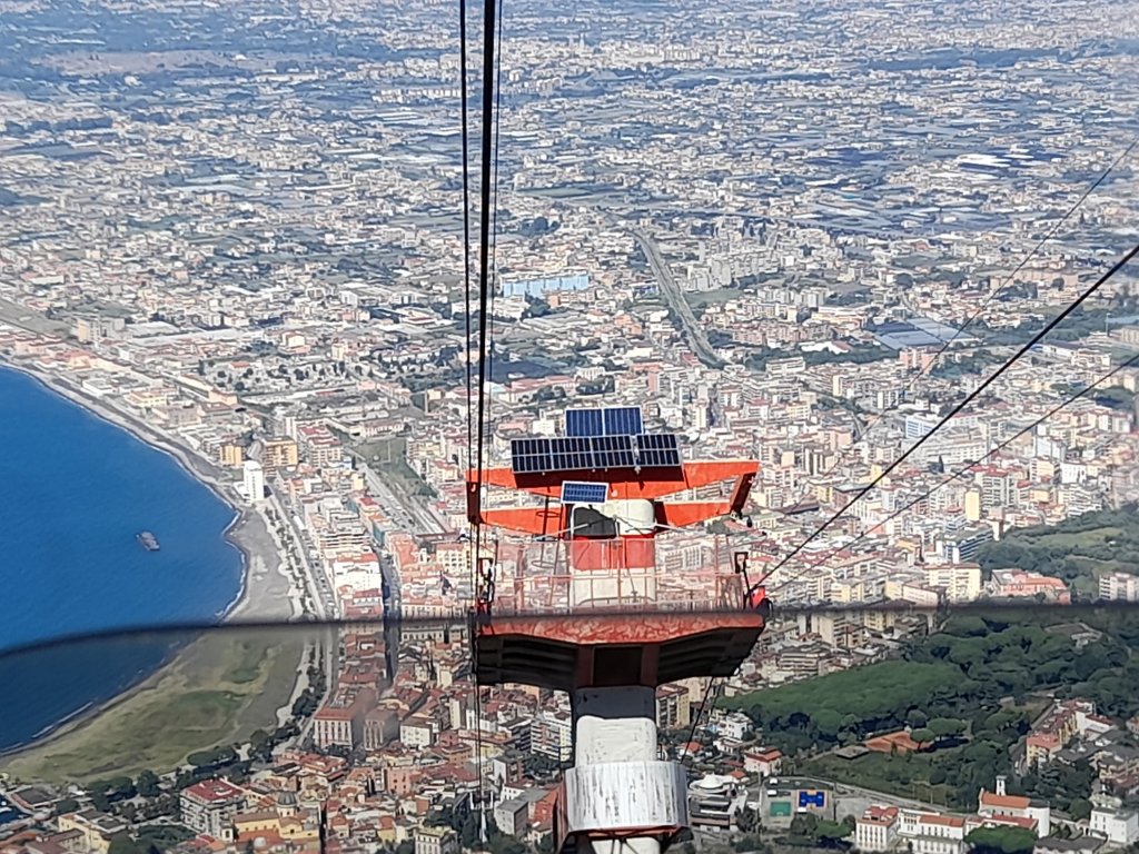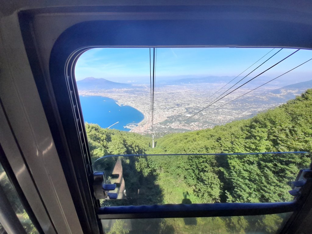 The cable car slowly began its ascent, and as we gained elevation, the world below transformed into a breathtaking panorama. To the east, the majestic Vesuvius loomed, its iconic silhouette dominating the horizon. Its history of destruction juxtaposed with the serene beauty of the moment.