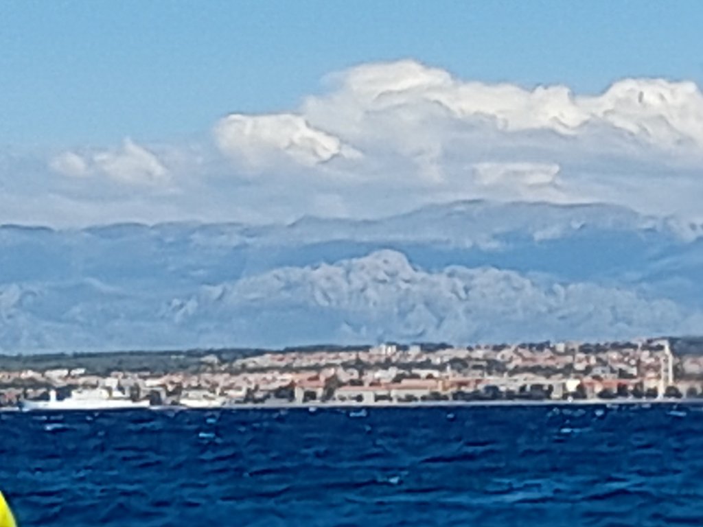 Looking back toward Zadar with the mountains in the background topped by the clouds